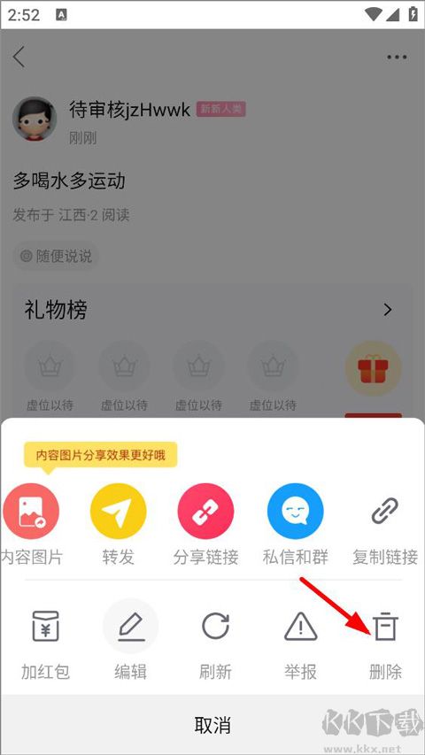 3、在彈出的功能選項里找到刪除按鈕,點擊后就能成功刪除帖子。