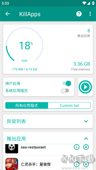 killappsapp是一款手機(jī)運(yùn)行內(nèi)存優(yōu)化軟件??梢钥焖訇P(guān)閉所有正在運(yùn)行的軟件,幫助提升手機(jī)運(yùn)行速度、改善手機(jī)性能。它的原理是結(jié)束手機(jī)里不必要的后臺(tái)軟件和進(jìn)程,可以延長(zhǎng)電池壽命、增加手機(jī)使用時(shí)長(zhǎng),還能幫助游戲加速、提升游戲性能,從根本上解決手機(jī)卡頓變慢的問題。需要的朋友快來下載試試吧!