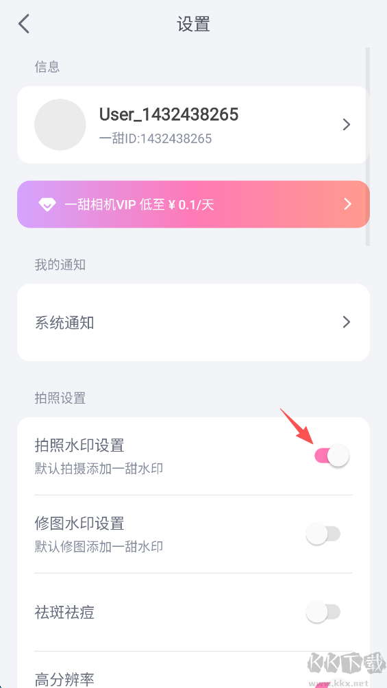 2、在點(diǎn)擊“拍照水印設(shè)置”右側(cè)的“開(kāi)關(guān)鍵”。