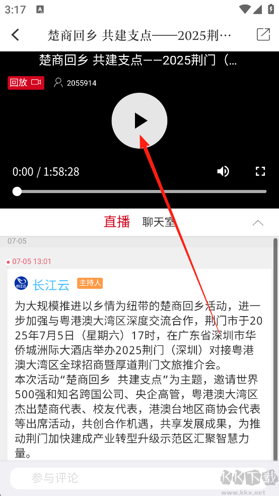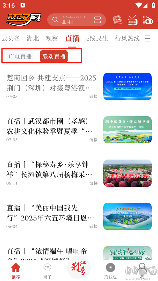 1、啟動(dòng)江漢風(fēng)應(yīng)用程序,輕觸【直播】入口。