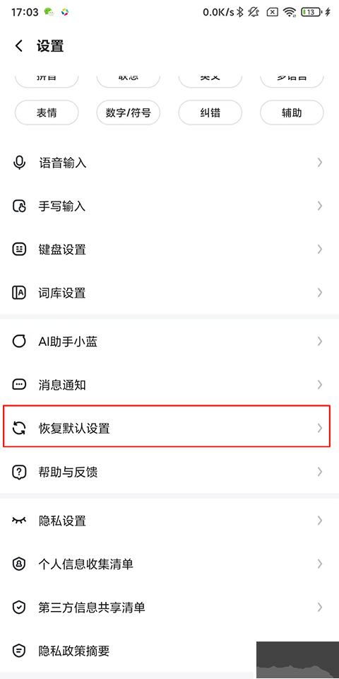 2、在設(shè)置頁找到并點(diǎn)擊恢復(fù)默認(rèn)設(shè)置;