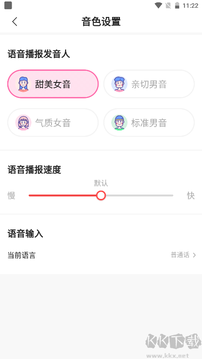 3、我們可以可按照自身喜好進(jìn)行音色的設(shè)置,比如說設(shè)置成甜美女音、親切男音等;還可以設(shè)置語音播報(bào)的速度;