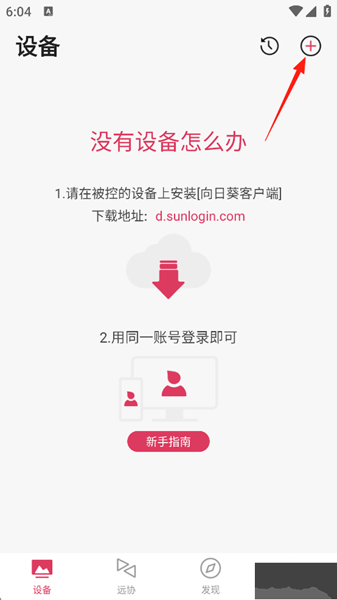 1、打開向日葵遠(yuǎn)程控制手機(jī)版,在首頁點(diǎn)擊右上角的+圖標(biāo);