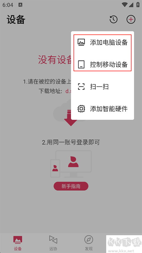 2、在彈出的功能列表中根據(jù)需求選擇添加電腦設(shè)備或控制移動設(shè)備;