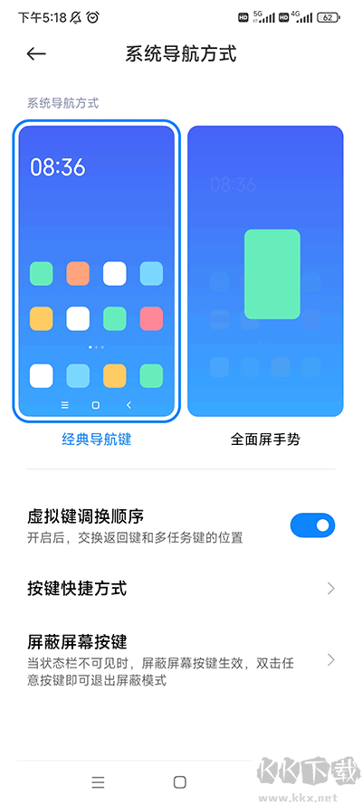 3、選取傳統(tǒng)按鍵模式,界面下方即顯現(xiàn)返回按鈕,全屏操作模式不配備此按鍵。