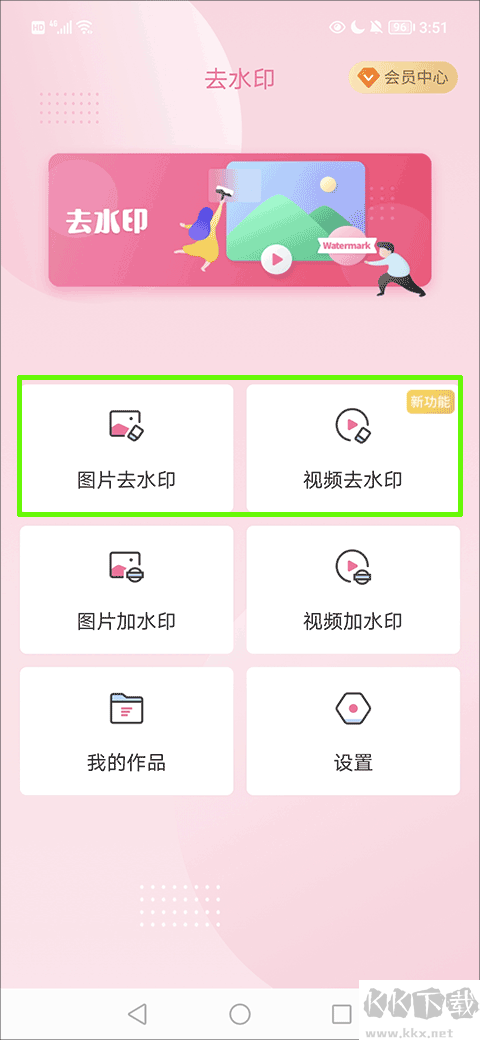 1、打開【去水印相機App】,在首頁選擇“圖片去水印”或“視頻去水印”功能,根據(jù)你需要處理的內(nèi)容進行選擇;