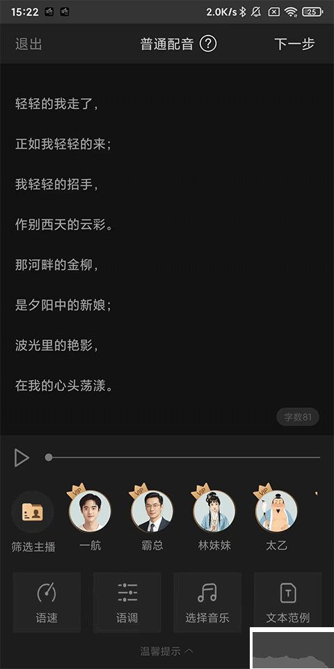 3、文案豐富:內(nèi)置大量樣音模板和優(yōu)質(zhì)的背景音樂庫,滿足多樣化的創(chuàng)作需求。
