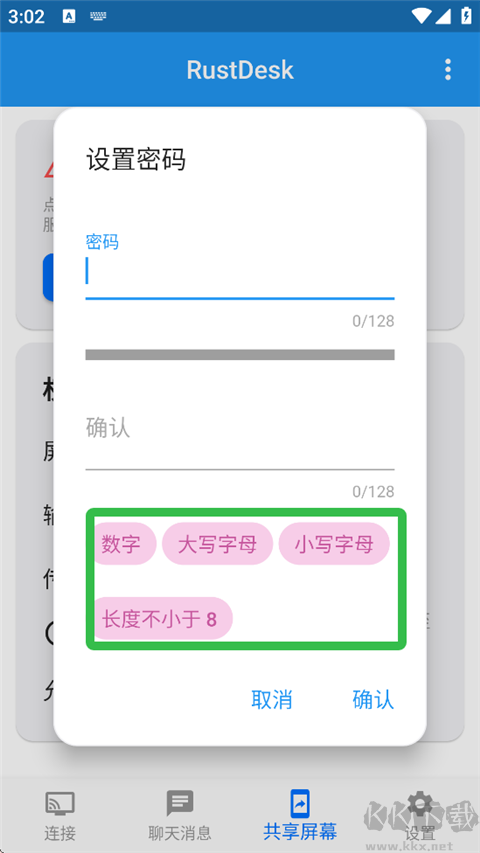 1、打開RustDesk,進(jìn)入【共享屏幕】頁(yè)面,點(diǎn)擊三點(diǎn)標(biāo)識(shí)。
