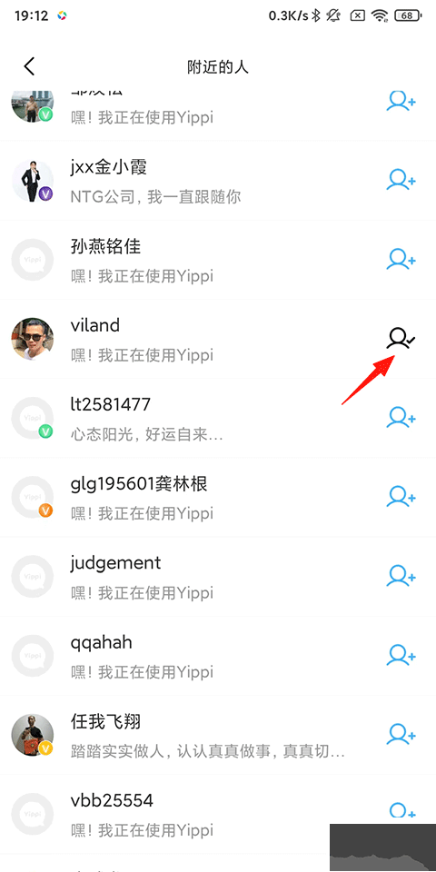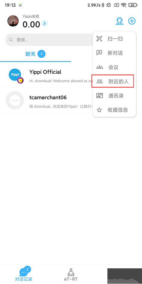 1、打開Yippi聊天軟件,點(diǎn)擊右上角的+按鈕,在彈出的列表中選擇附近的人;