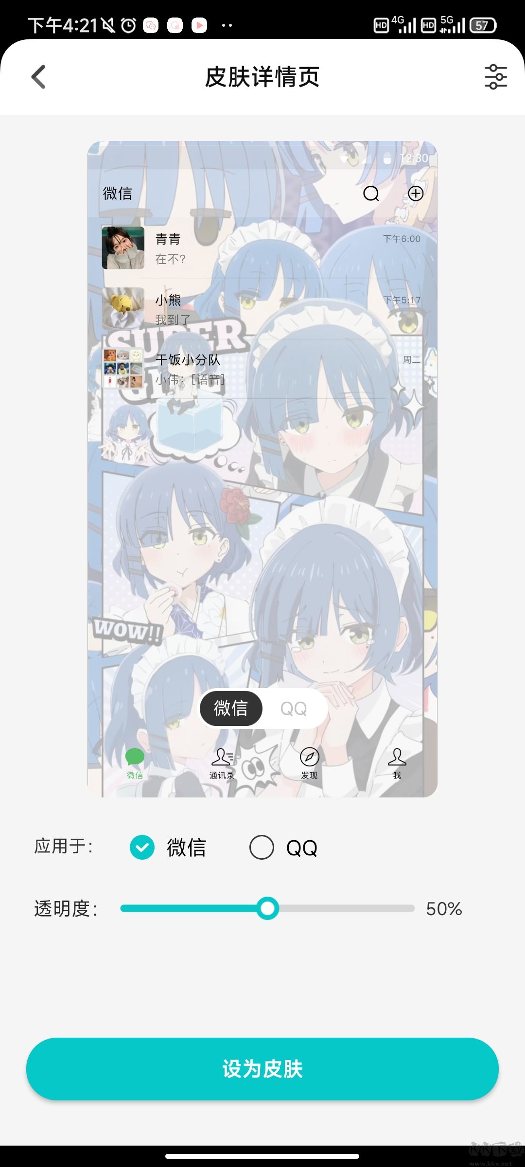 3、在皮膚詳情頁(yè)內(nèi)將應(yīng)用于微信選項(xiàng)勾選,以及調(diào)整透明度后點(diǎn)擊設(shè)為皮膚就可以了,記得開(kāi)啟所需要的權(quán)限。