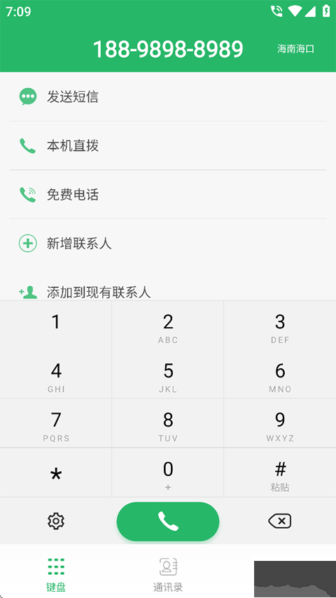 1、打開北瓜電話官方版軟件,在鍵盤頁可以直接撥打注冊(cè)了北瓜電話的用戶,還可以發(fā)送短信、本機(jī)直撥、新增聯(lián)系人等;