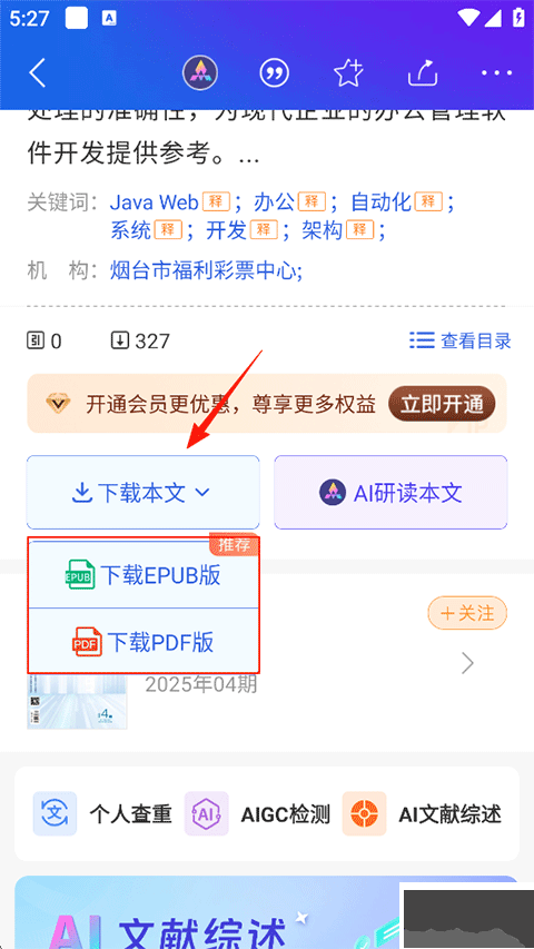 3、打開(kāi)需要下載的論文,往下滑動(dòng),點(diǎn)擊下載本文,選擇下載格式即可;注意:下載論文到本地需要付費(fèi)。