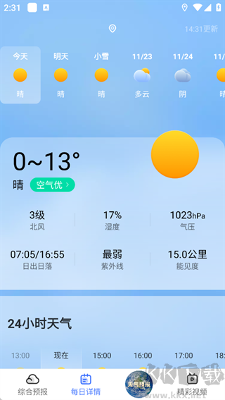 可查看今日及未來幾日天氣,包含氣溫范圍、空氣質(zhì)量、日出日落、紫外線、能見度等信息,以及24小時天氣變化,滿足用戶對天氣細(xì)節(jié)的查詢需求。