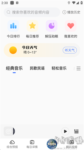 整合天氣播報與音頻內(nèi)容,用戶可聽天氣,還能瀏覽今日排行、每日推薦、解壓助眠等音頻分類,在獲取天氣信息的同時享受音頻服務(wù)。