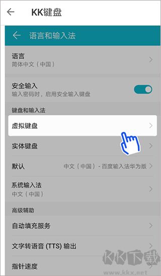 3、還可以選擇去手機(jī)的設(shè)置頁(yè)面里找到“語(yǔ)言和輸入法”功能,從“虛擬鍵盤(pán)”的功能里設(shè)置KK鍵盤(pán)為默認(rèn)輸入。