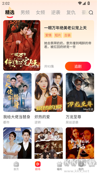3、點(diǎn)擊劇場(chǎng),這里有很多好看的短劇資源,各種類型,男頻、女頻、逆襲、復(fù)仇、豪門這里全都有!