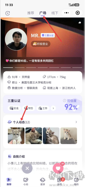 1、個(gè)人主頁(yè)安排三項(xiàng)認(rèn)證步驟,學(xué)業(yè)職業(yè)身份依次審核,并列明身高星座等資料,自身近況與個(gè)人說明多角度表達(dá),協(xié)助使用者塑造可靠形象。