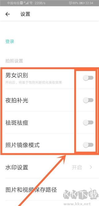 5、在設(shè)置界面依次啟動(dòng)性別識(shí)別、夜間補(bǔ)光、瑕疵修整及影像鏡像功能。