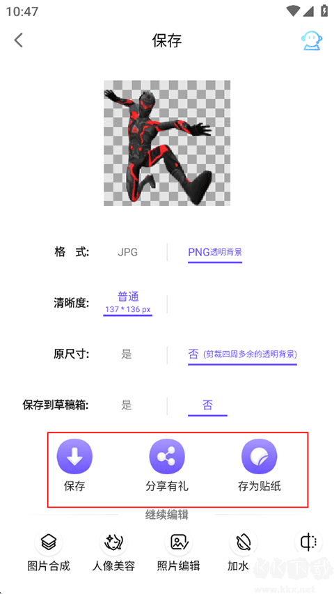 4、存儲(chǔ)界面可更改文件類(lèi)型、畫(huà)質(zhì)與大小,亦能分享或轉(zhuǎn)為貼紙,最后點(diǎn)擊保存。