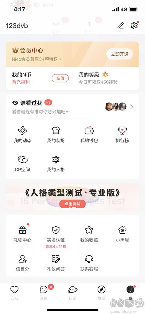1、進入軟件后,點擊“我的” 在頁面中間用戶可以進行多種性格測試,測試完成后,系統(tǒng)就可以匹配相同愛好的好友。