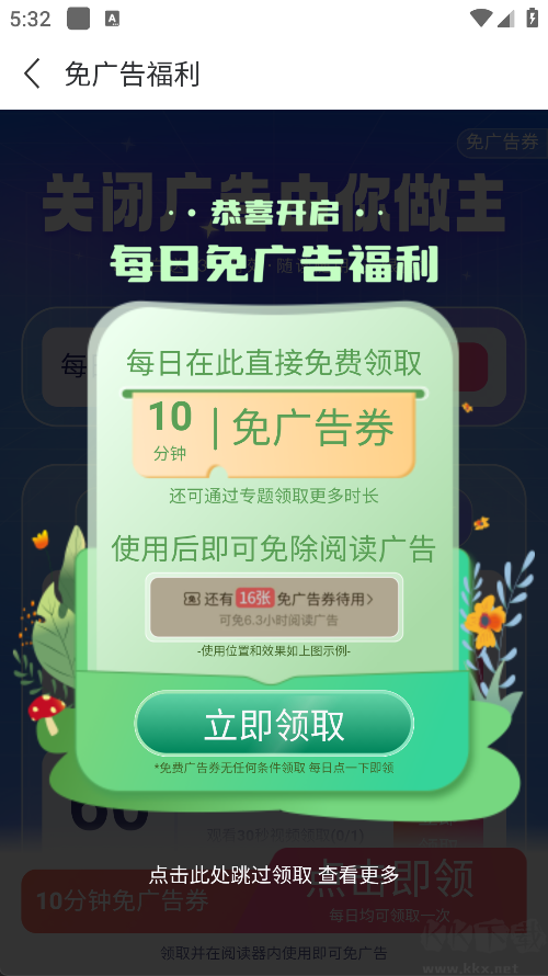 2、進(jìn)入后即可看到免廣告福利,點(diǎn)擊【立即領(lǐng)取】后即可生效。