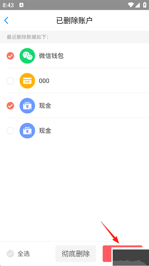 3、進入后選擇需要恢復的數(shù)據(jù)賬戶,點擊恢復即可。