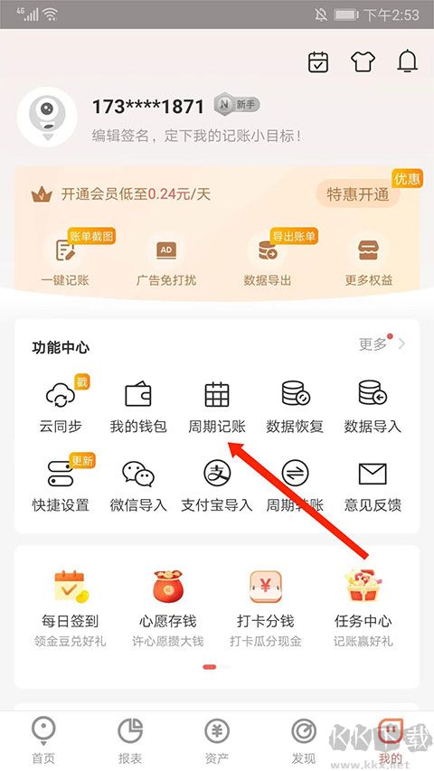 2、在用戶中心界面,選擇“周期記賬”選項,