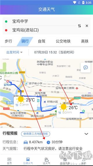 3、之后就會(huì)顯示距離和時(shí)間以及最關(guān)鍵的天氣情況。