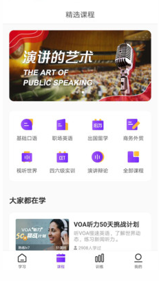 7、涵蓋生活口語、四六級口語、商務(wù)英語、外貿(mào)英語、演講辯論、出國留學(xué)、職場英語等模塊,一站式滿足學(xué)生備考、留學(xué)、求職、個(gè)人提升等學(xué)習(xí)需求,在強(qiáng)化聽說技能訓(xùn)練的同時(shí),培養(yǎng)文化溝通力、批判性思維以及職業(yè)素養(yǎng)