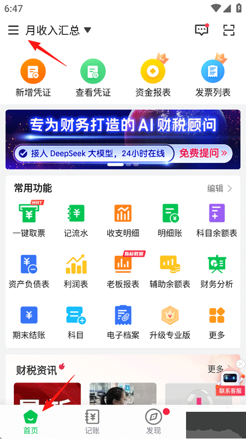 1、打開(kāi)檸檬云財(cái)務(wù)軟件,點(diǎn)擊首頁(yè)-左上角的三橫桿擴(kuò)展按鈕;