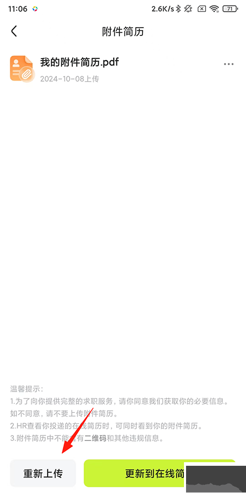 2、進(jìn)入后點(diǎn)擊下方的上傳簡(jiǎn)歷附件;