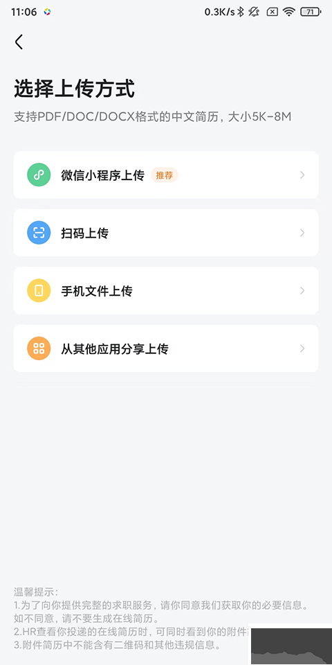 3、選擇上傳簡(jiǎn)歷附件方式;