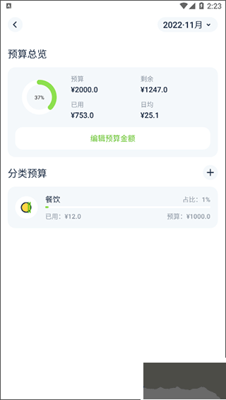 2、還可以設(shè)置支出預(yù)算,隨時隨地查看預(yù)算已用和剩余總覽,能夠更好的防止超支;