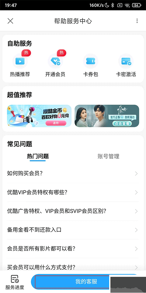 1、打開優(yōu)酷App進入首頁,點擊“我的”-“我的客服”;