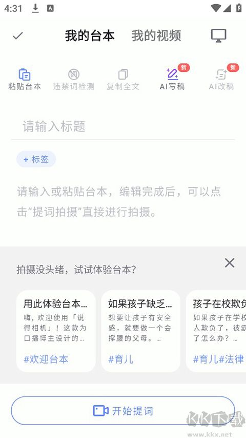 3、新建臺本后,用戶需要輸入視頻所需要的臺本內(nèi)容以及自己定義標題。