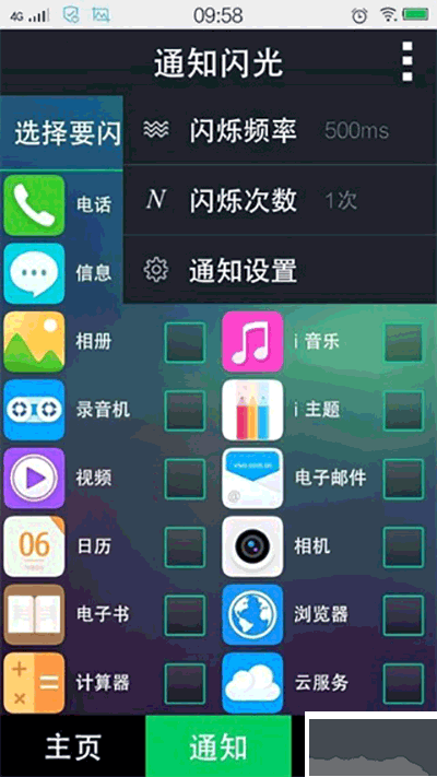 在通知閃光設置中,手動開啟微信、QQ的閃光開關(guān);