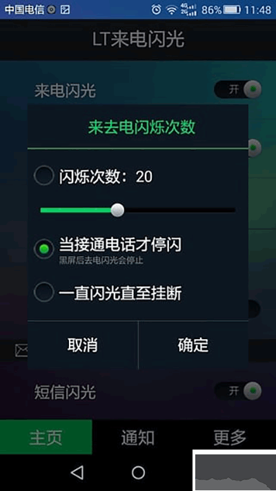 5、勾選“一直閃光直至掛斷”,則從響鈴開始到通話結(jié)束全程持續(xù)閃爍,掛斷后才停止。