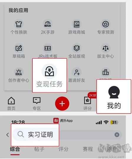 1、打開軟件,點擊【我的】-【變現(xiàn)任務(wù)】或者在虎撲社區(qū)搜索【實習(xí)證明】