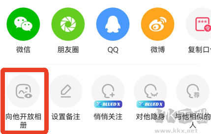 2、下方會(huì)彈出一些功能菜單,點(diǎn)擊第一個(gè)【向他開放相冊(cè)】就可以了。