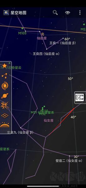 4、菜單圖標(biāo)自上而下依次代表:恒星、星座、梅西耶天體、行星、赤經(jīng)赤緯坐標(biāo)網(wǎng)格及地平線。當(dāng)僅開啟恒星顯示時(shí),畫面已高度接近真實(shí)夜空。此外可切換至夜間模式,屏幕將轉(zhuǎn)為暗色并采用紅色調(diào)。通過底部縮放按鈕或雙指手勢,均可便捷放大或縮小星圖。