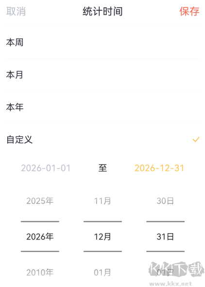 3、滑動(dòng)選擇全年范圍,先設(shè)置開始時(shí)間,然后再點(diǎn)擊結(jié)束時(shí)間開始設(shè)置,完成后點(diǎn)擊右上方的【保存】。這里以2026.1.1-2026.12.31為例。
