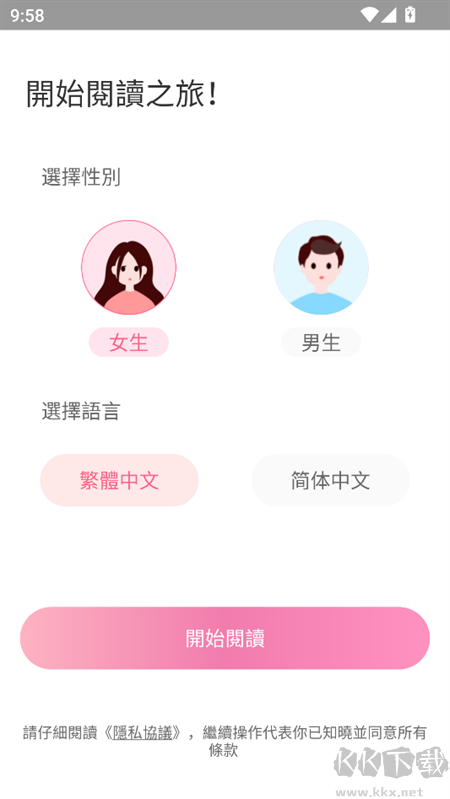 1、打開軟件,選擇不同的性別開始使用,就可以看到提供最為精準的小說推薦。