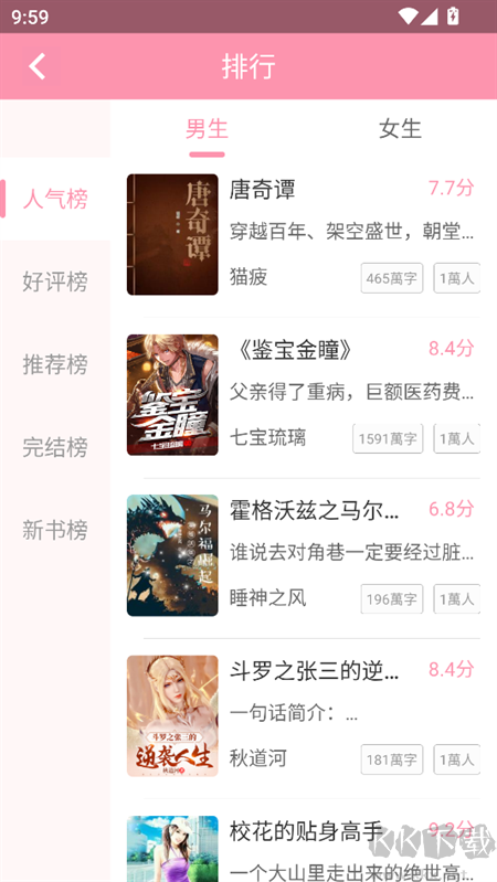 3、在排行榜板塊下,我們可以通過人氣榜、好評榜、推薦榜、完結(jié)榜等找到自己喜歡的小說。