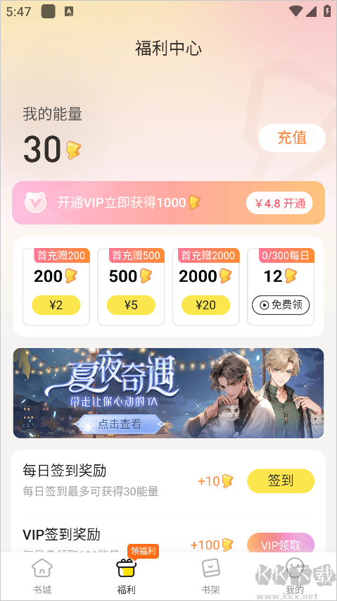 啟動(dòng)應(yīng)用即可看到書城、分類、福利、書架及個(gè)人中心等清晰入口,操作直觀順暢。