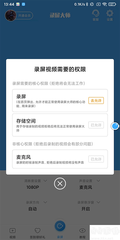 2、將錄屏需要的權(quán)限都打開(kāi)即可開(kāi)始錄屏;