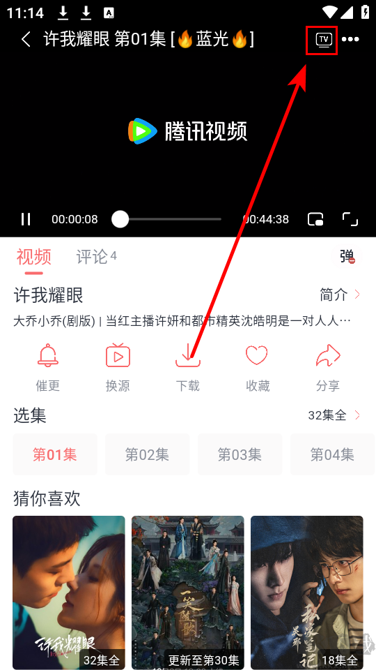 1、在播放頁面點擊右上角的TV圖標,軟件會自動搜索投屏設備。
