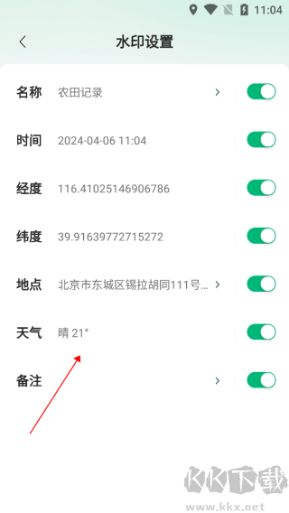 3、可選擇需要的要素使用,名稱、時間、經(jīng)度、緯度、地點、天氣或是添加備注