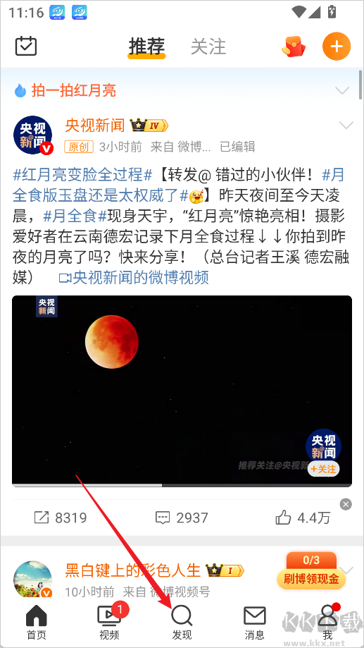 1、打開微博App,點擊底部導(dǎo)航欄的【發(fā)現(xiàn)】按鈕。