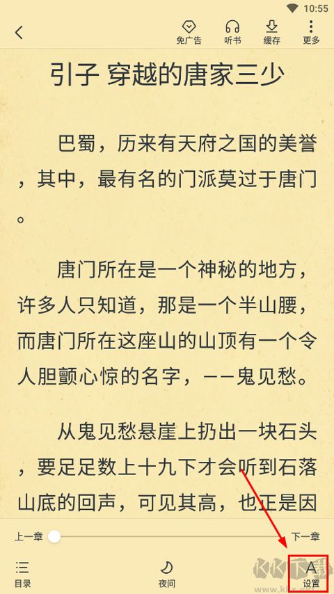 1、打開(kāi)小說(shuō)后,點(diǎn)擊屏幕中間,然后點(diǎn)擊右下角設(shè)置;