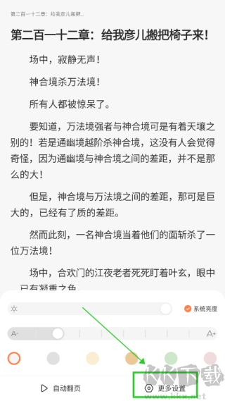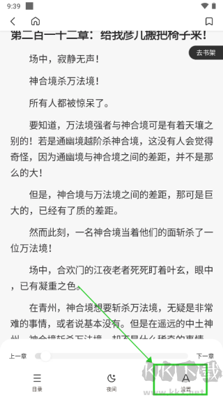 2、進入小說頁面后,點擊中間位置打開設(shè)置面板,點擊右下角的設(shè)置